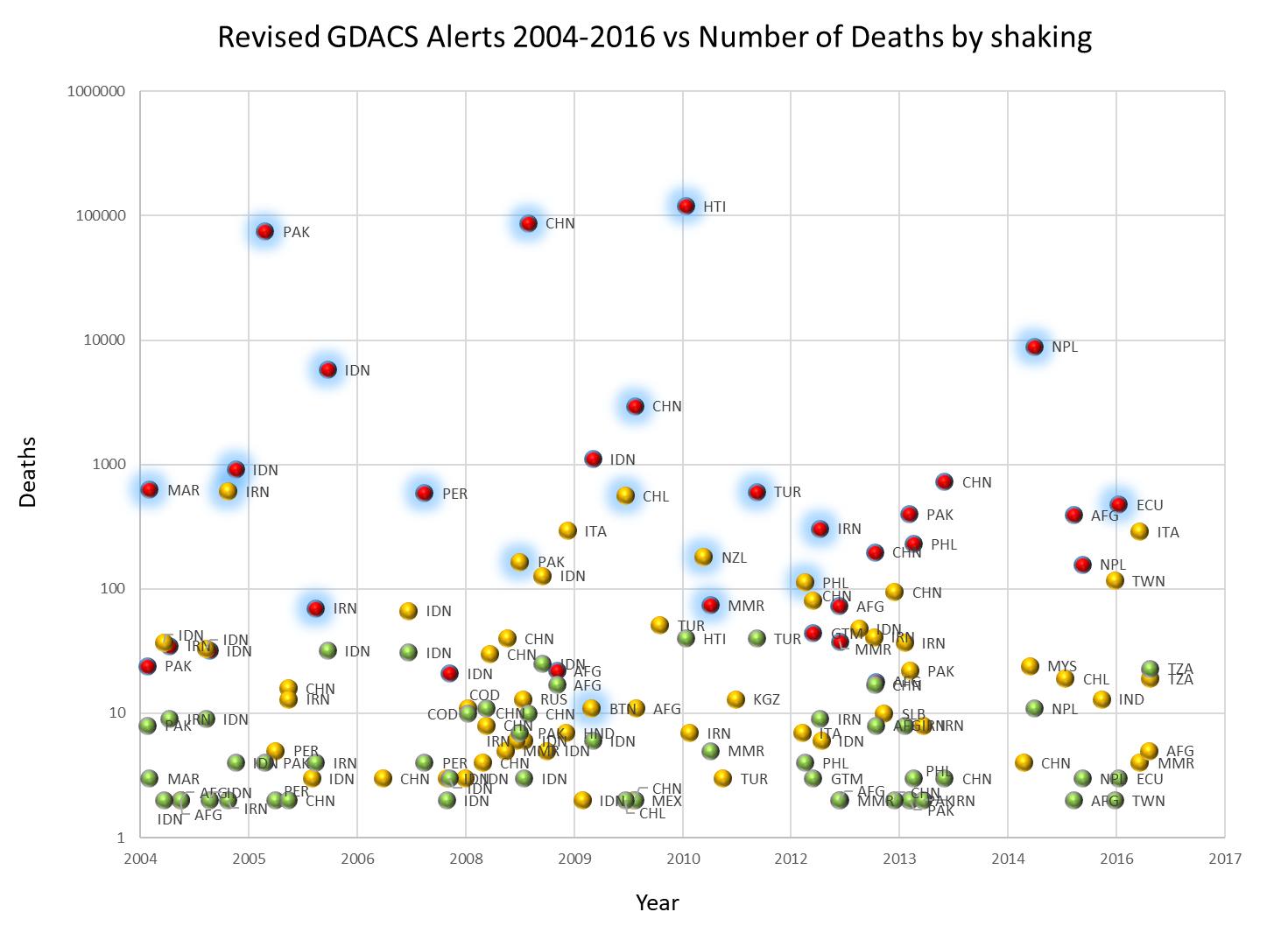 Revised GDACS alerts 2004-2016 vs number of deaths by shaking